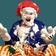 Messymissmia was pied in the face with a real-crust pie by Big Bird the Clown